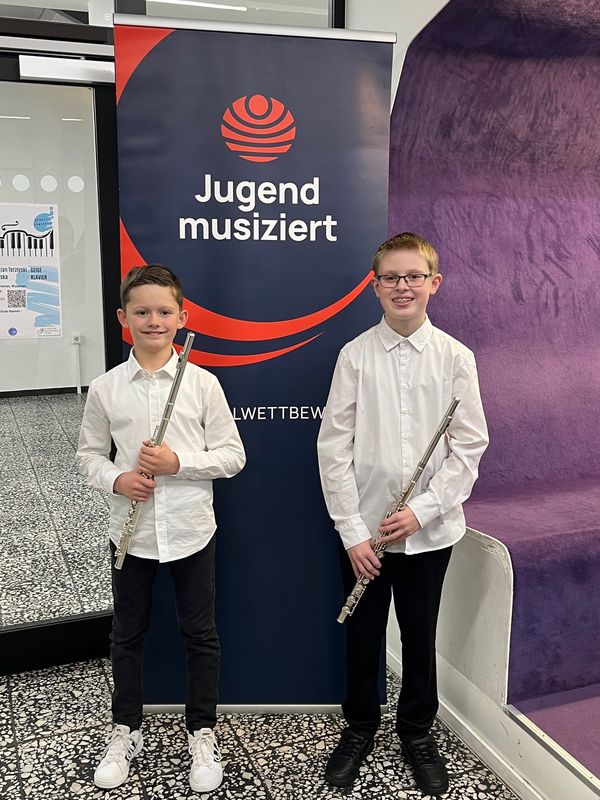 Noah Erbel und Bastian Lange (Klasse: Adelheid Wagner-Usler) konnten in der Wertung „Gleiche Blasinstrumente“ Altersgruppe III ebenfalls einen ersten Preis mit Weiterleitung zum Landeswettbewerb erspielen.